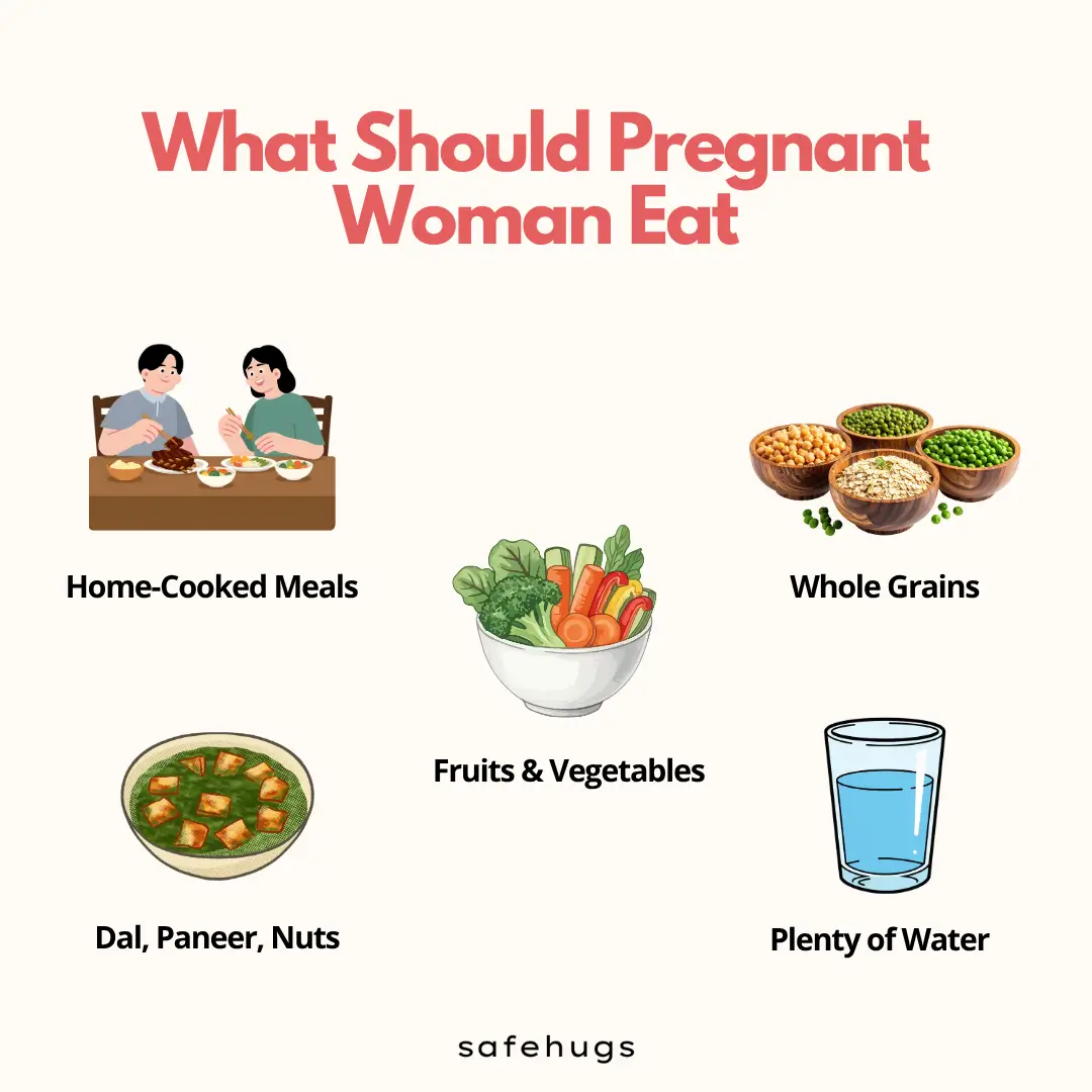 Freshly prepared, home-cooked meals are the safest and most reliable option during pregnancy. They ensure better hygiene, controlled ingredients, and balanced nutrition compared to outside or processed foods.