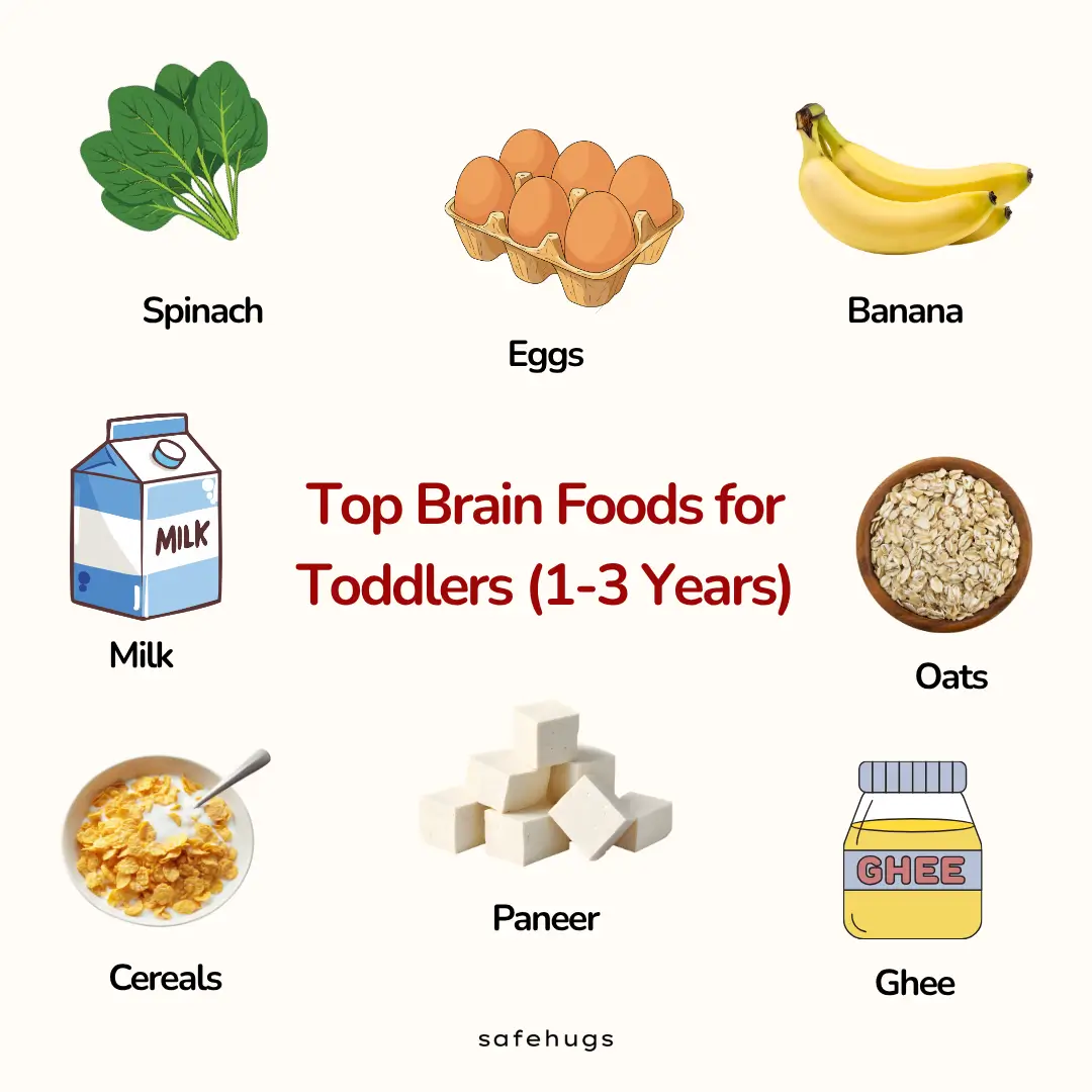 Eggs are one of the best foods for brain development in toddlers. They are rich in protein and choline, which support memory, learning, and brain cell function. Always serve eggs fully cooked, such as boiled, scrambled, or as an omelette.